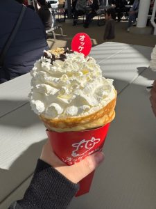 全然中身が見えませんが、中にはチョコソース、バナナ、ナッツ、その上に盛り盛りのクリーム♡クリームが意外と軽くてふんわり甘さ控えめのしっかりミルク味でした。軽くてふんわりなので雲を食べている気分なので0キロカロリーですね!?笑